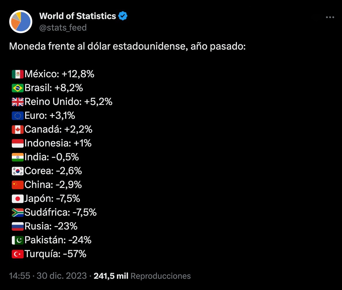 A través de sus redes sociales compartió un comparativo de la cuenta de X, World of Statistics, que presenta a México como el país líder en el ranking con una apreciación del 12.8 por ciento en relación con el dólar estadounidense.
