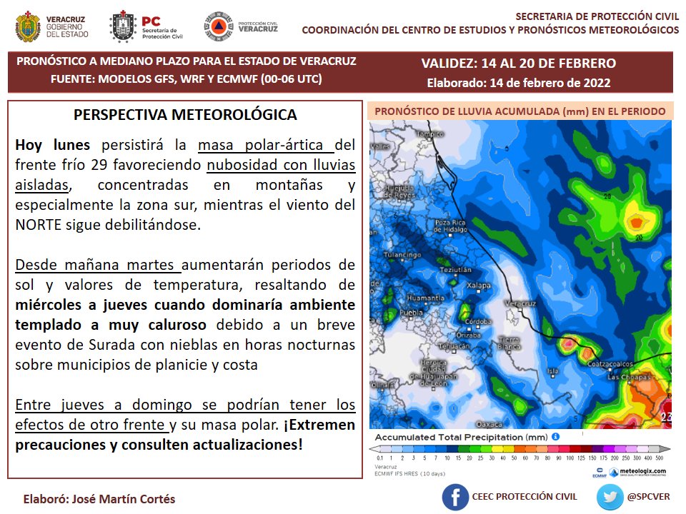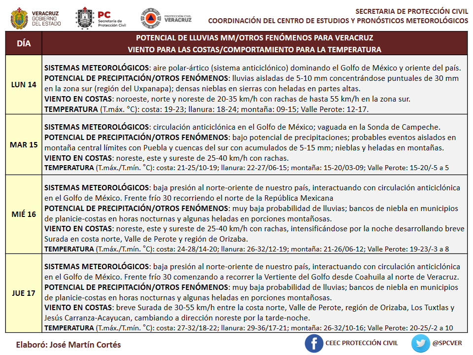 Xalapa, Ver.- El subcoordinador de meteorología de la Secretaría de Protección Civil del Estado de Veracruz, Federico Acevedo Rosas informó que se prevé un nuevo evento de norte para la zona conurbada Veracruz-Boca del Río, estimado a registrarse entre el jueves 18 y viernes 19 de febrero.