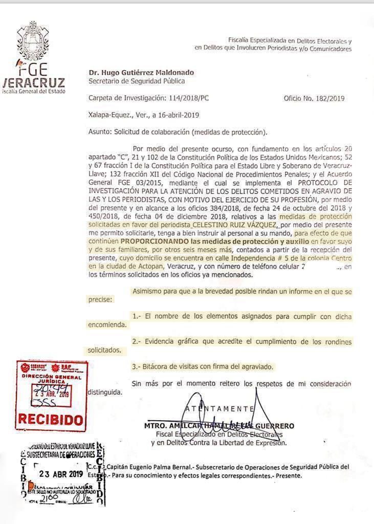 Con la finalidad de ampliar información al respecto, hacemos de conocimiento público las solicitudes oficiales enviadas a esta dependencia por la Fiscalía Especializada, las cuales documentan y evidencian los hechos constitutivos de delitos cometidos en agravio del periodista por parte de alcalde de Actopan José Paulino Domínguez Sánchez y el director de Obras Públicas del mismo Ayuntamiento.