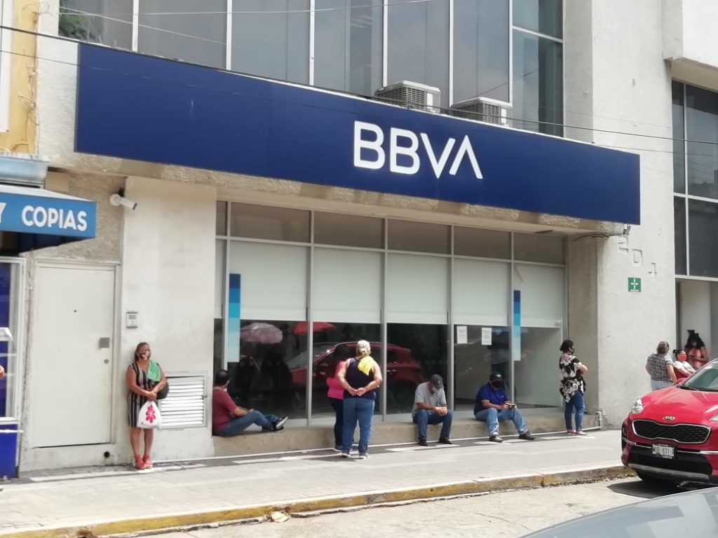 Con una bocina de la unidad oficial, se hacen llamados a la población que están afuera de la sucursales bancarias y en negocios a no aglomerarse.