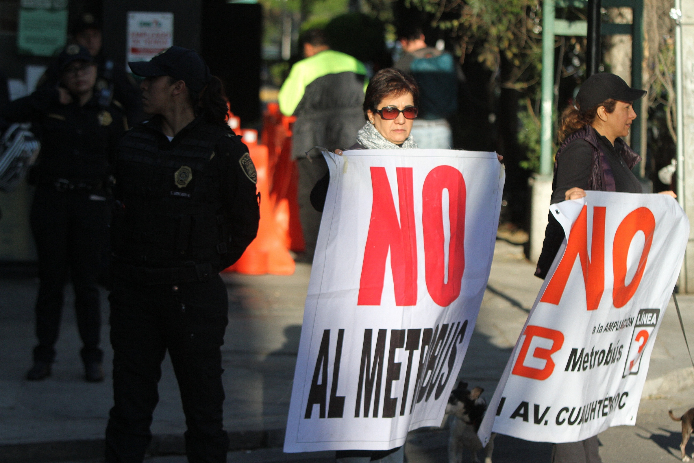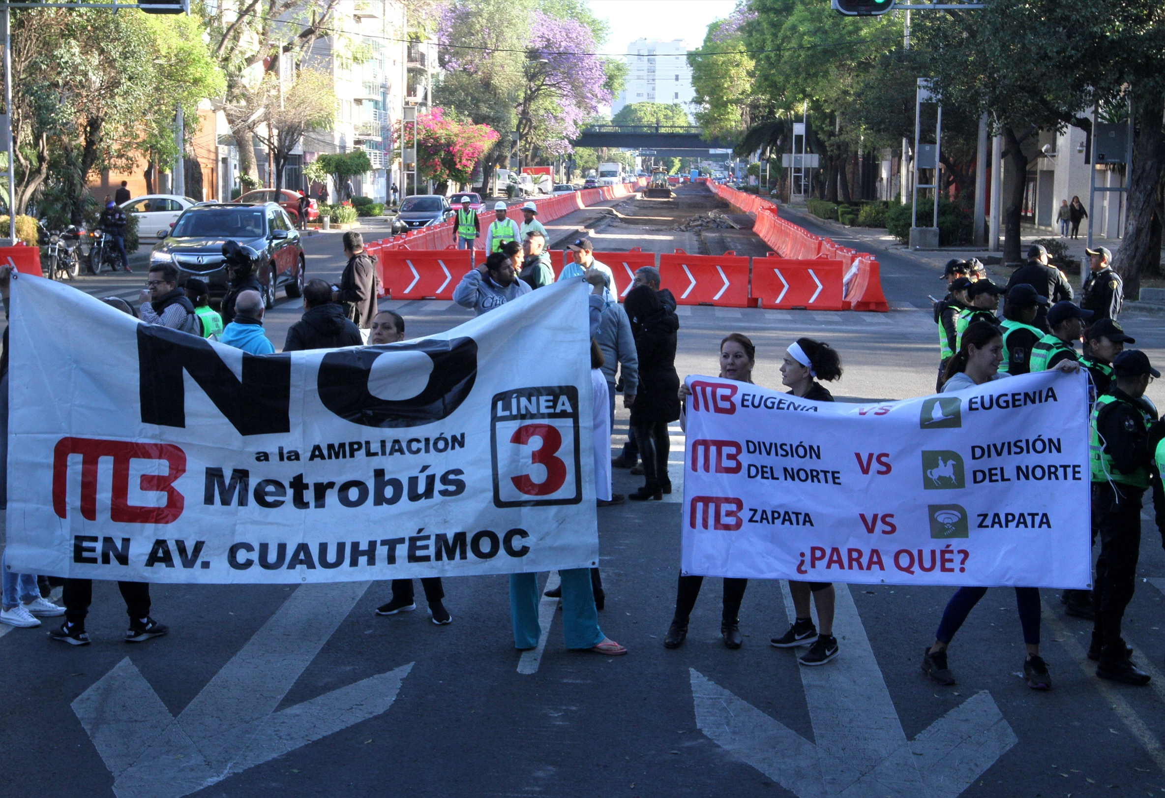 Ciudad de México.- Vecinos de la Alcaldía Benito Juárez protestan contra la ampliación de la línea 3 del metrobus sobre la avenida Cuauhtémoc.