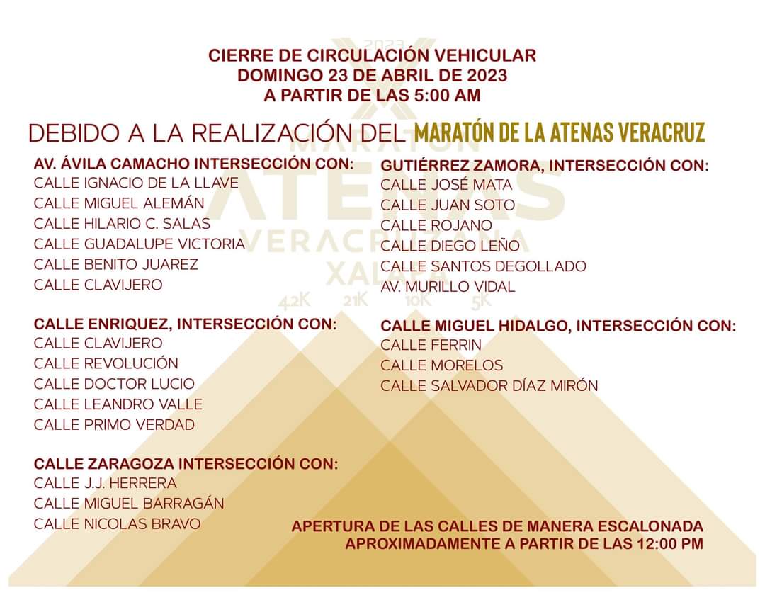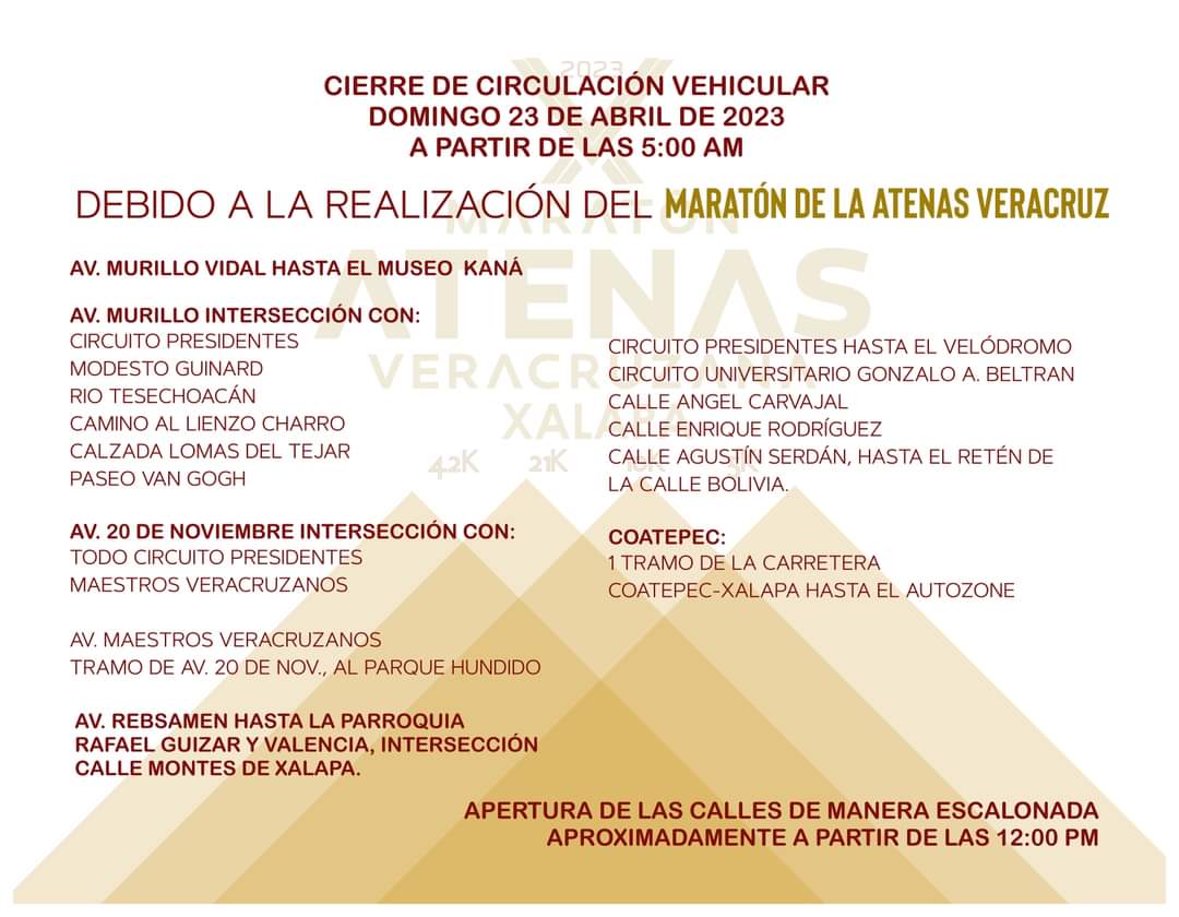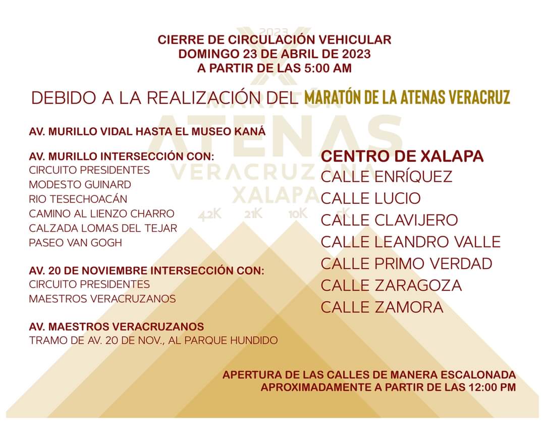 Xalapa, Ver. – Debido al Maratón de la Atenas Veracruzana 2023 a realizarse el próximo domingo 23 del presente en esta ciudad capital, se informa que serán cerradas a la circulación vehicular algunas calles a partir de las 5 de la mañana y se irán abriendo de manera escalonada a partir del mediodía.