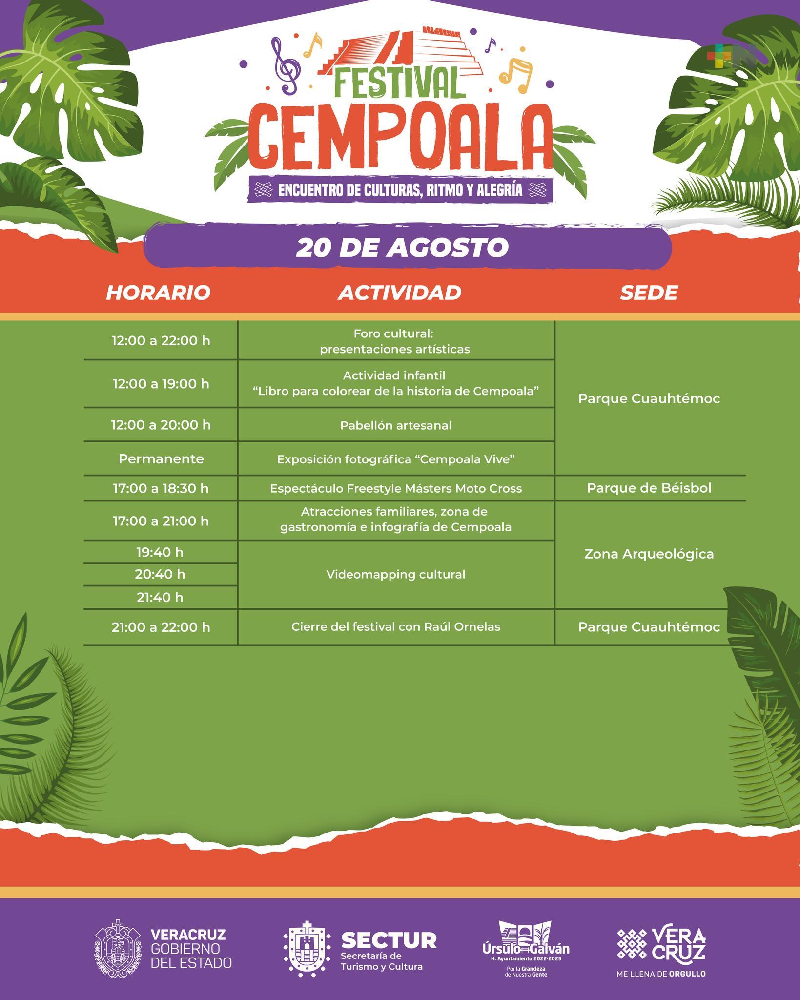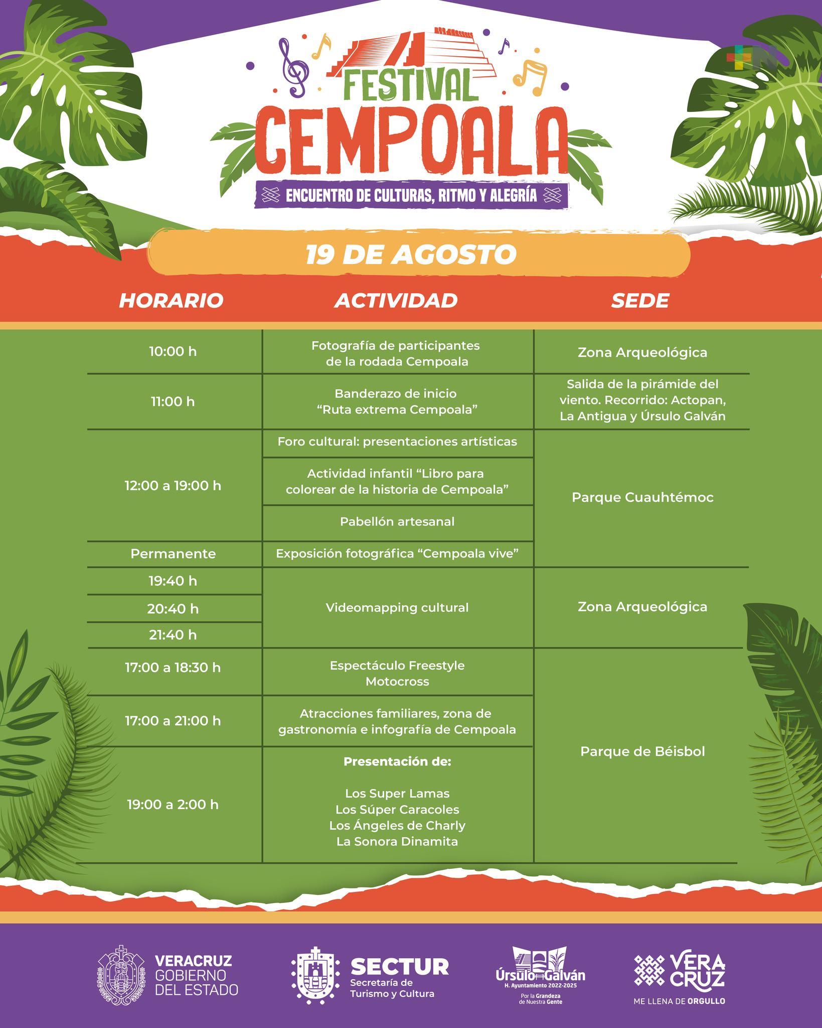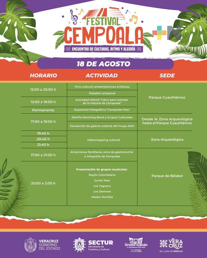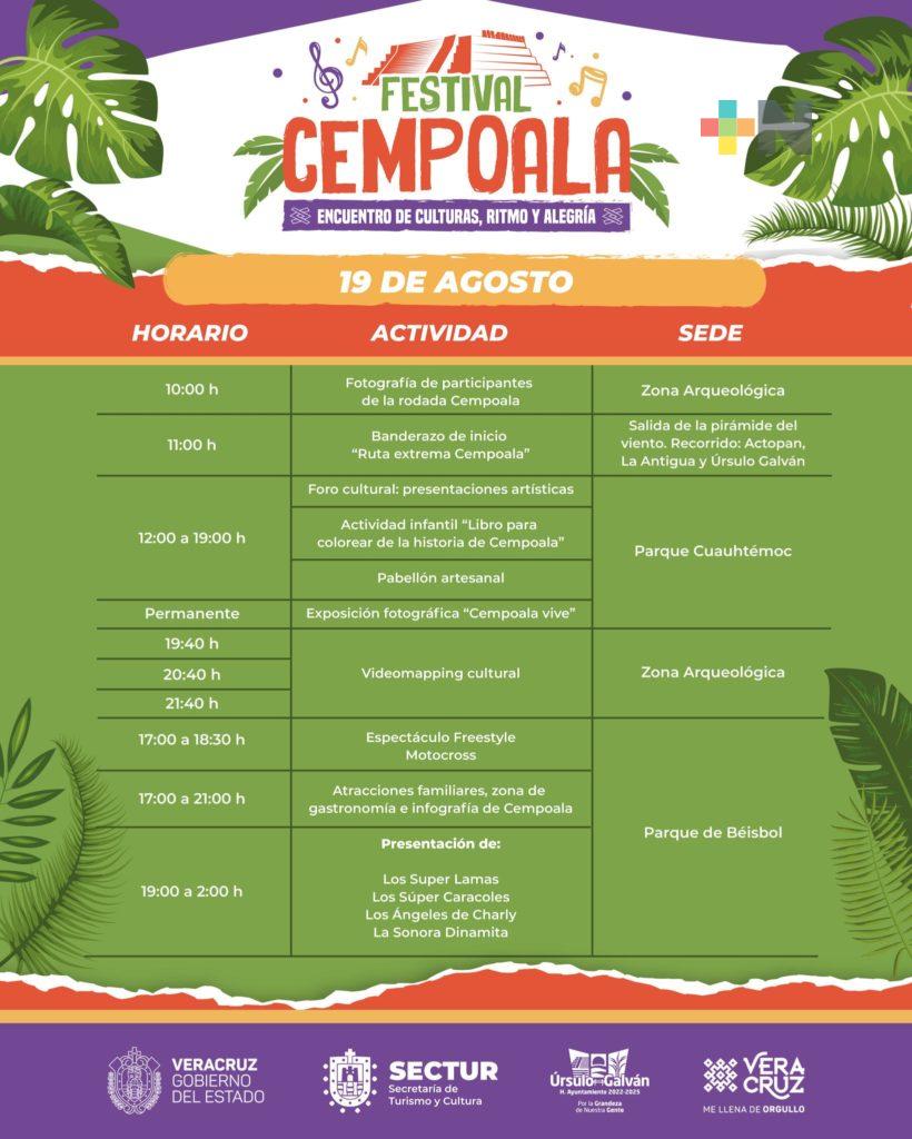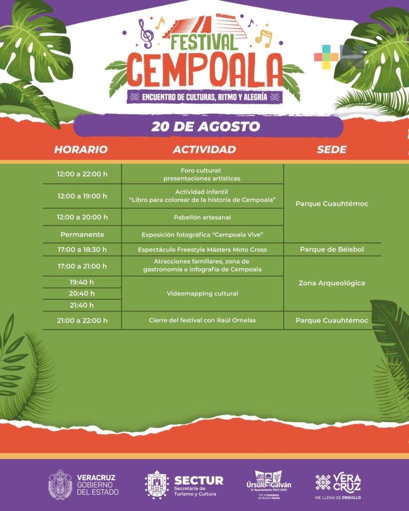 Veracruz, Ver.- A través del perfil oficial en Facebook Festival Cempoala se ha dado a conocer el programa oficial de las actividades a realizarse del 18 al 20 de agosto en el municipio sede.