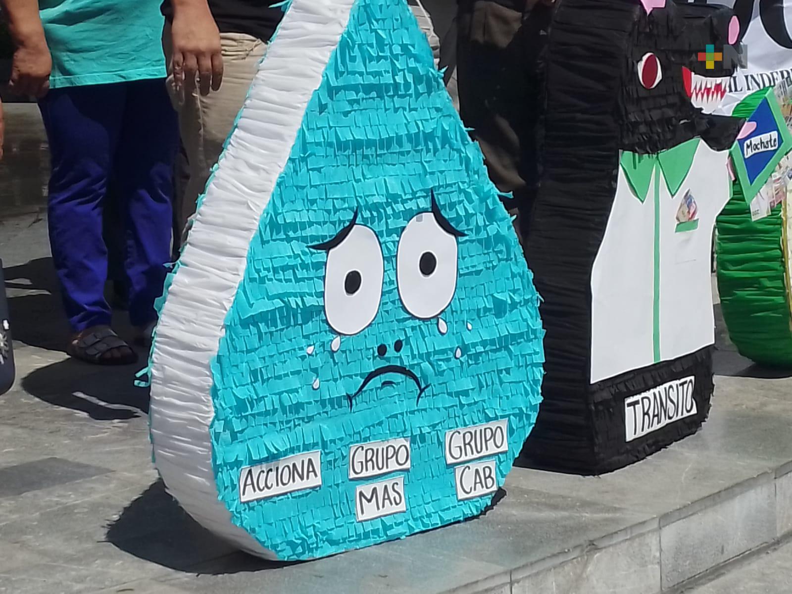 Veracruz, Ver.- En el zócalo de la ciudad de Veracruz, ciudadanos de diferentes puntos de la zona conurbada, quemaron piñatas a modo de protesta contra el mal servicio de Grupo MAS y los abusos de la Dirección de Tránsito municipal.
