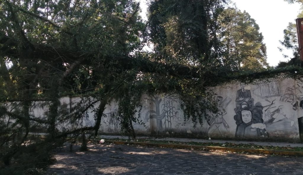 Ahí mismo la barda de la Escuela Experimental quedó colapsada al recibir el impacto de un árbol.