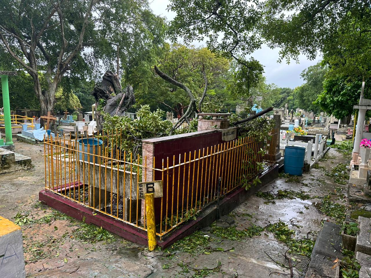 “Tenemos las puertas abiertas para los ciudadanos que lleguen, así nada más se les recomienda que con mucho cuidado porque hay mucha rama en los pasillos que cayeron, apenas estamos dando el rondín ahorita que se calmó tantito la lluvia, estamos revisando como está el panteón, entonces, a los ciudadanos que llegan se les pide que si van a entrar que sea con mucho cuidado porque está muy resbaloso y hay ramas que están así como dañadas, esas son las recomendaciones que se les están dando”.