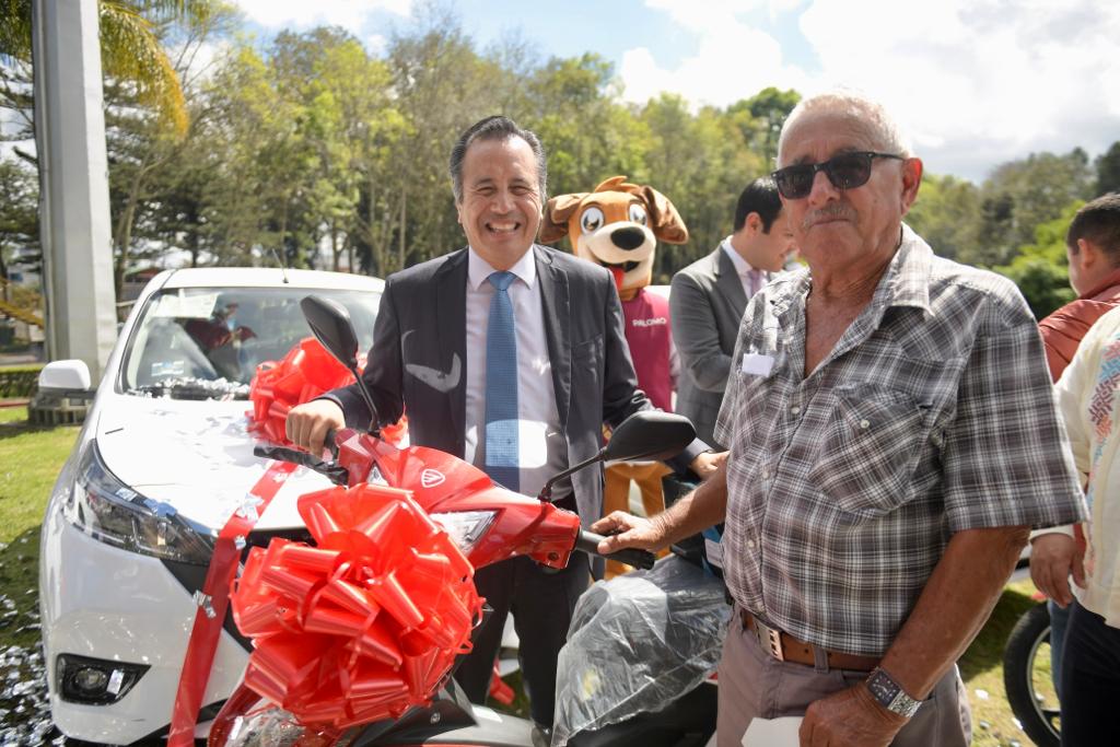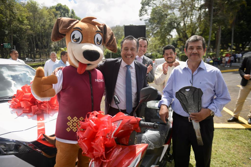 Xalapa, Ver.- Cinco vehículos, diez motocicletas y cincuenta computadoras portátiles fueron entregadas este en la explanada de la Secretaría de Finanzas y Planeación, participantes del programa «Veracruz premia tu cumplimiento».
