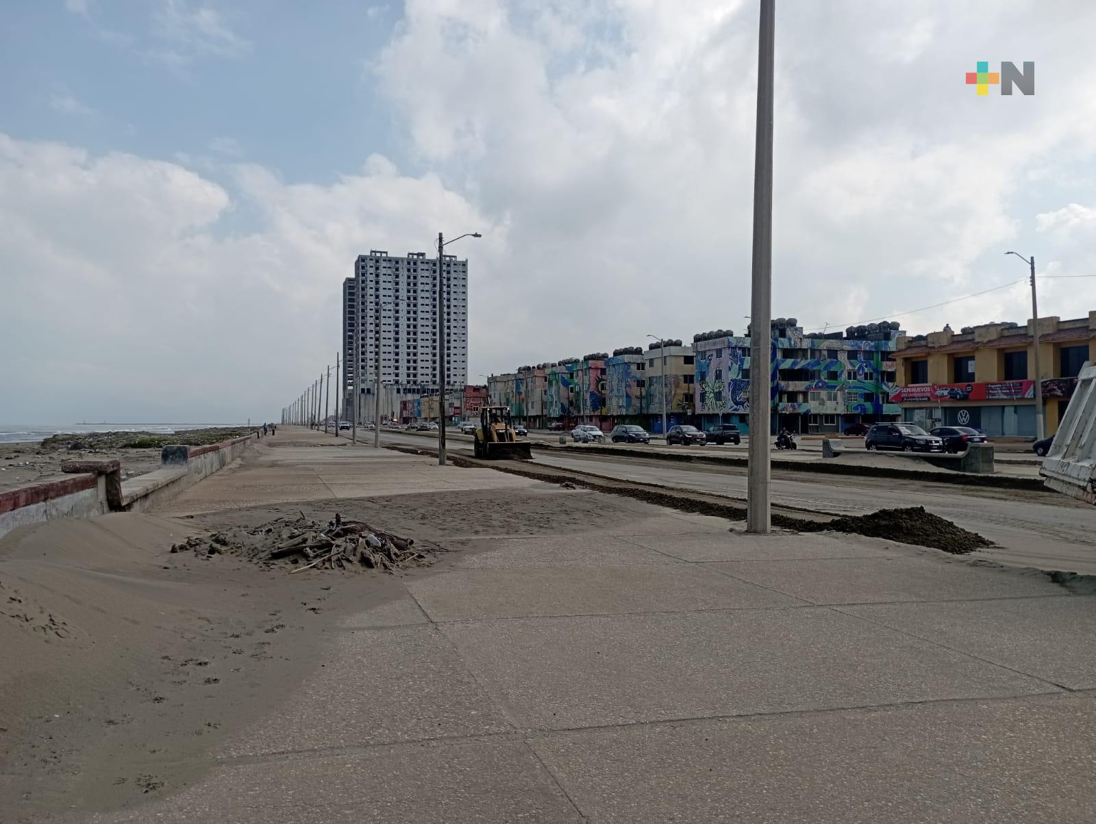 Coatzacoalcos, Ver.- Personal del área de Infraestructura Urbana y de Limpia Pública continúan realizando labores de limpieza y retiro de arena del malecón costero, lo que provocó el cierre intermitente de esta importante vía de comunicación.