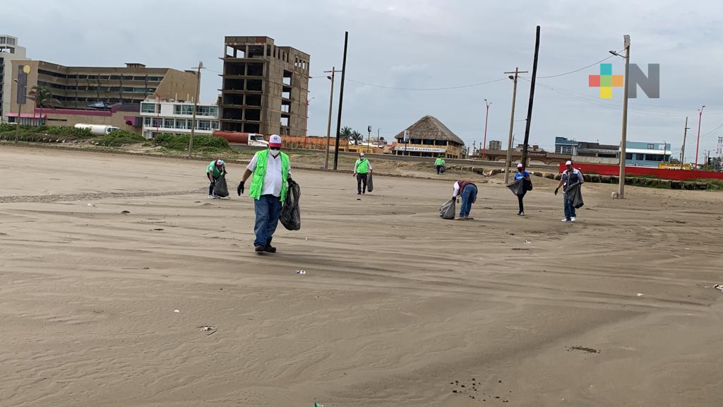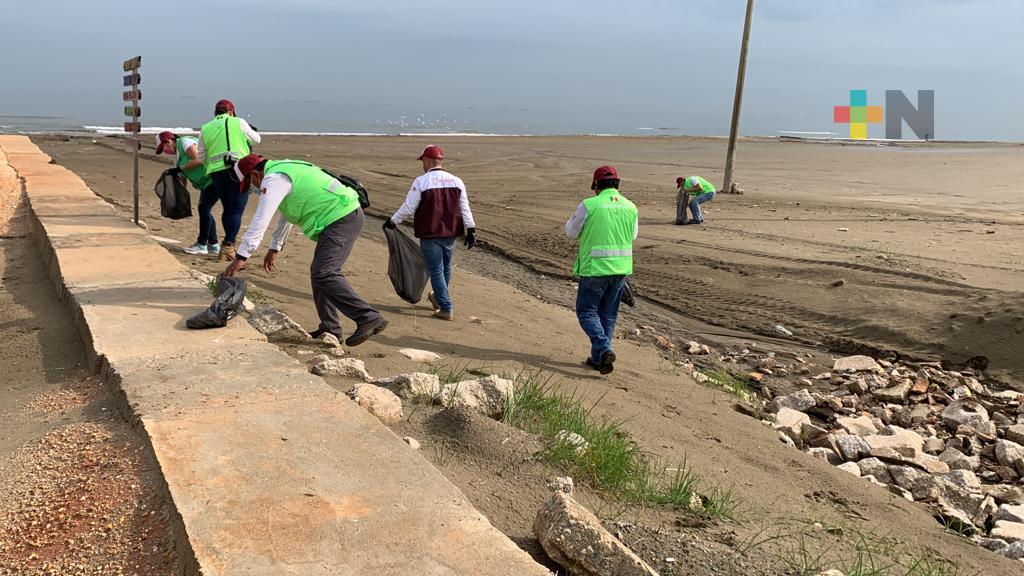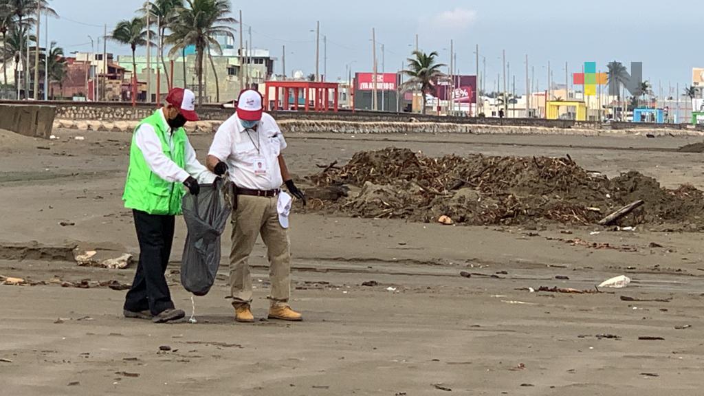 Coatzacoalcos, Ver.- Personal de la Secretaria de Salud y empresas participaron en la limpieza de dos kilómetros de playa de Coatzacoalcos.