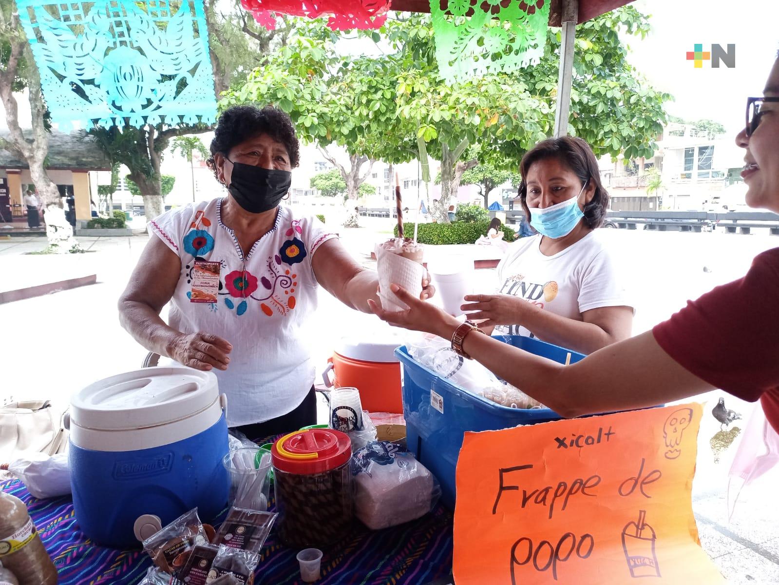 “Vendemos el popo, el frappé de popo, el chocolate que nosotros lo preparamos allá en Jáltipan; el apoyo de una hermana que tengo y mis hijos, entre todos ellos estudiaron eso y de ahí le sacamos el frappé, la masa para popa y la masa para champurrado, ya viene preparado todo nada más para prepararlo”.