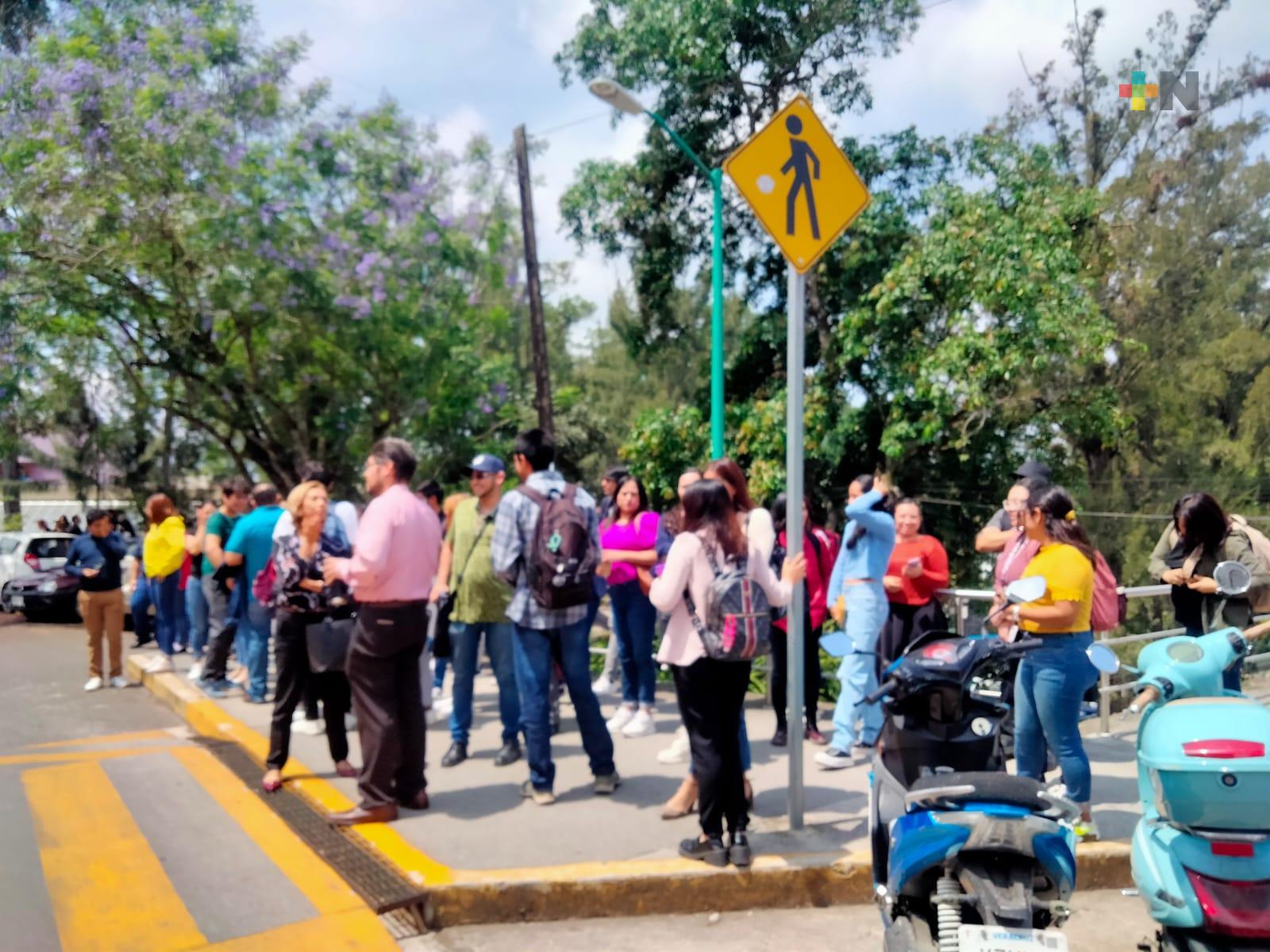 Estudiantes de la Facultad de Derecho, de Administración y de Pedagogía del Sistema de Enseñanza Abierta (SEA) de la Universidad Veracruzana evacuaron aulas y edificios del campus Xalapa como parte de un simulacro por sismo.