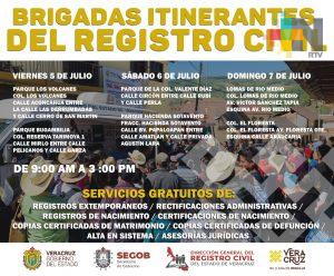 Xalapa, Ver.- La Secretaría de Gobierno realizará la Brigada Itinerante del Registro Civil en la zona conurbada Veracruz-Boca del Río durante los días viernes 5, sábado 6 y domingo 7, de 9 de la mañana a 3 de la tarde.
