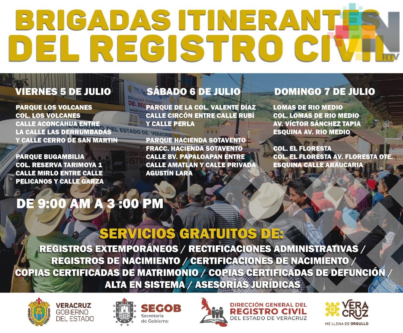 Xalapa, Ver.- La Secretaría de Gobierno realizará la Brigada Itinerante del Registro Civil en la zona conurbada Veracruz-Boca del Río durante los días viernes 5, sábado 6 y domingo 7, de 9 de la mañana a 3 de la tarde.