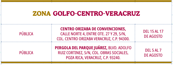 En Veracruz se realizará en Poza Rica del 5 al 7 de agosto, en Orizaba de 15 al 17 de agosto y en Pánuco del 22 al 23 de agosto.