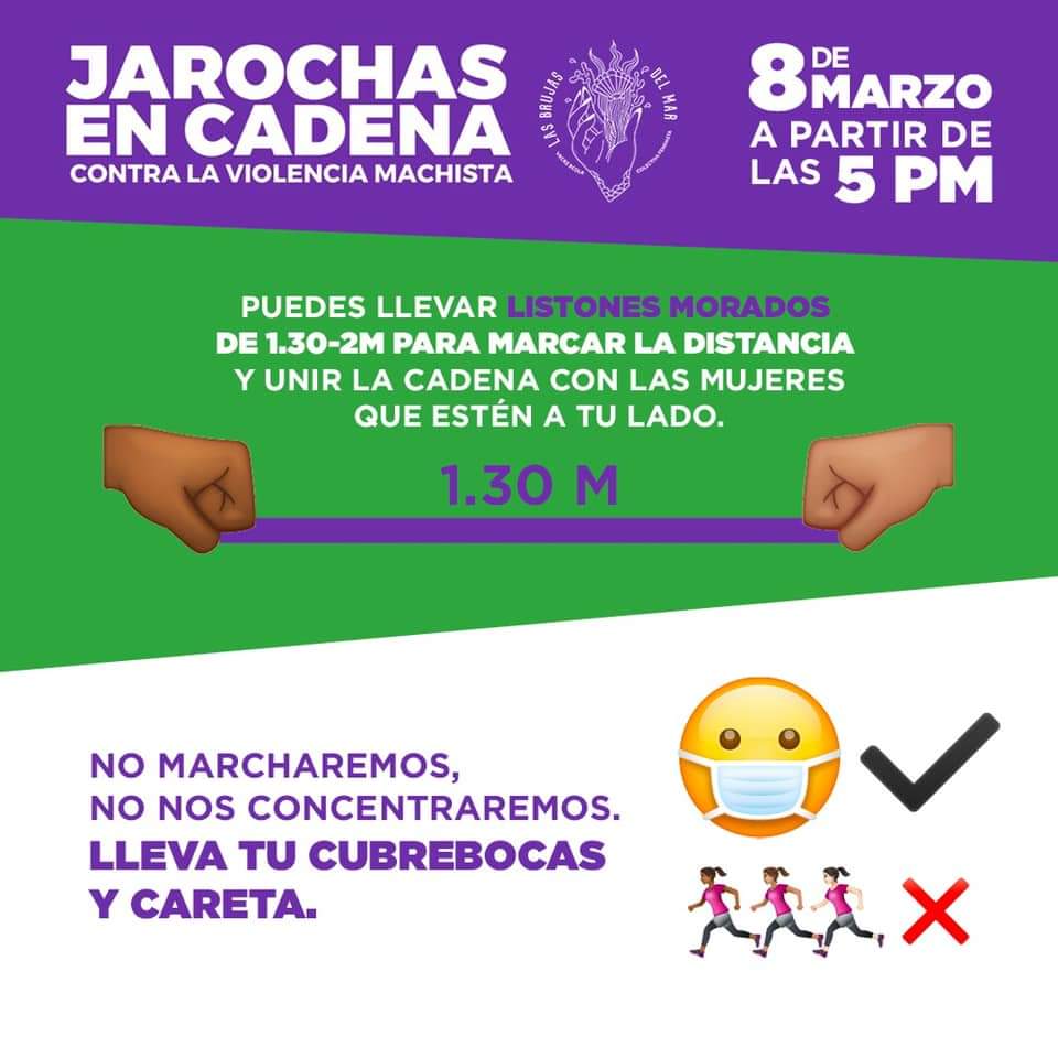 Arusi Unda, vocera de la Colectiva Las Brujas del Mar, dijo que la convocatoria al 8M consiste en reunir al mayor número de ciudadanas sobre el bulevar Ávila Camacho, para que se coloquen una junto a otra a una distancia de 1.3 metros que se delimitará con un listón morado.