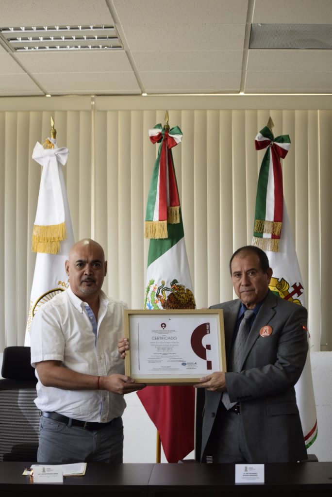 Xalapa, Ver.- El Lic. Héctor Manuel Riveros Hernández, Comisionado del Instituto de la Policía Auxiliar y Protección Patrimonial para el Estado de Veracruz (IPAX), recibió la constancia de Recertificación en la Norma de Calidad ISO 9001-2015, otorgada por el Ingeniero Carlos Miranda Arvizu, presidente del organismo certificador Quality Solution Register (QSR).