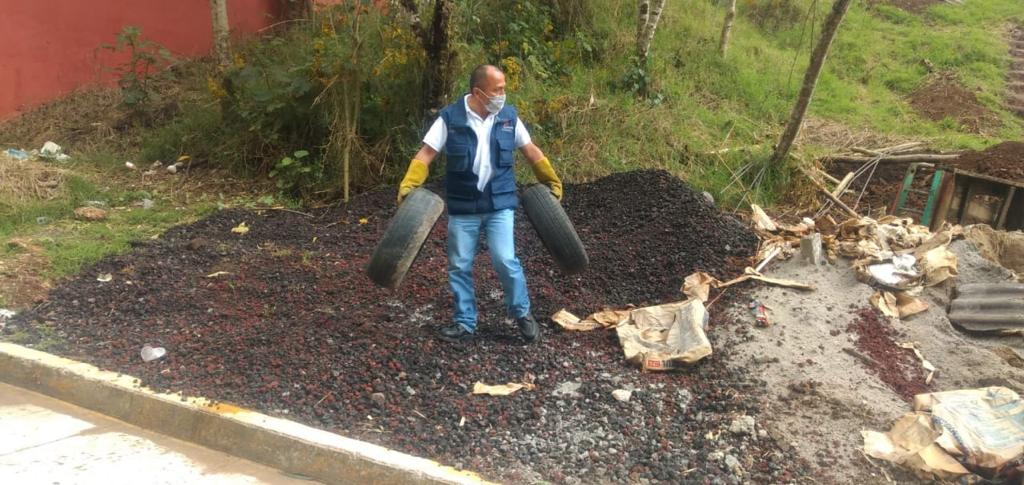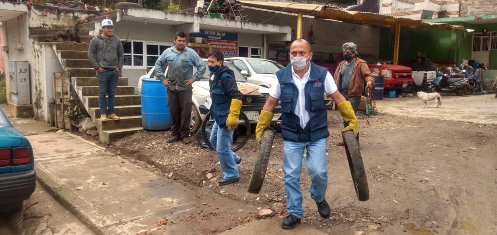 Xalapa, Ver.- Las fuertes lluvias que se han registrado en la ciudad aumentan el riesgo de que se reproduzca el mosquito transmisor del dengue, por lo que este sábado personal y funcionariado del Departamento de Regulación Sanitaria, con el apoyo de trabajadores de la Jurisdicción Sanitaria V y de la Subdirección de Gestión Integral de Residuos Sólidos, realizaron una jornada de descacharrización en la colonia Mártires de Chicago.