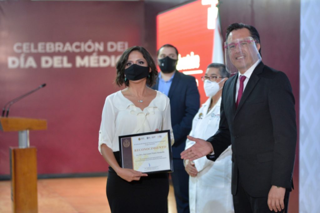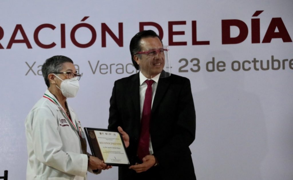 El gobernador entregó el galardón Doctor Pedro Rendón Domínguez a la doctora Araclei Cabrera Mujica, jefa del Servicio de Cirugía del Hospital de Boca del Río por sus 43 años de servicio.