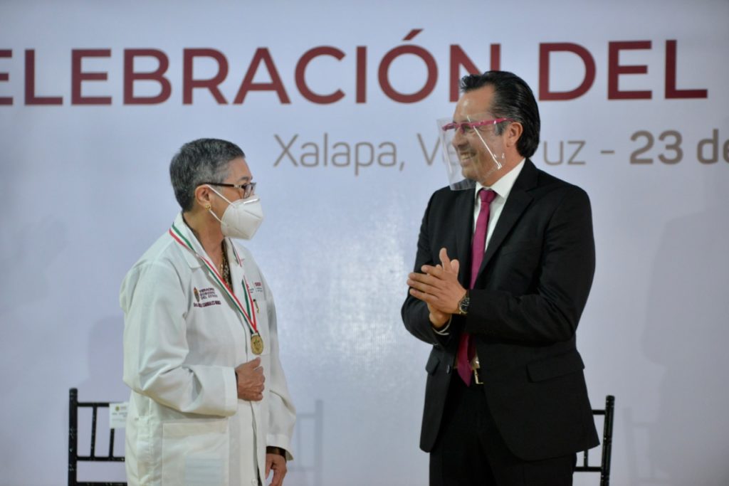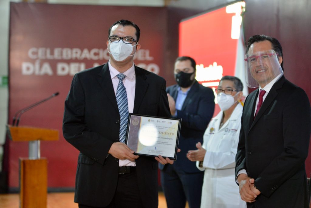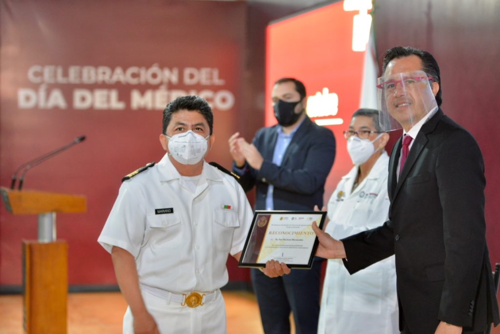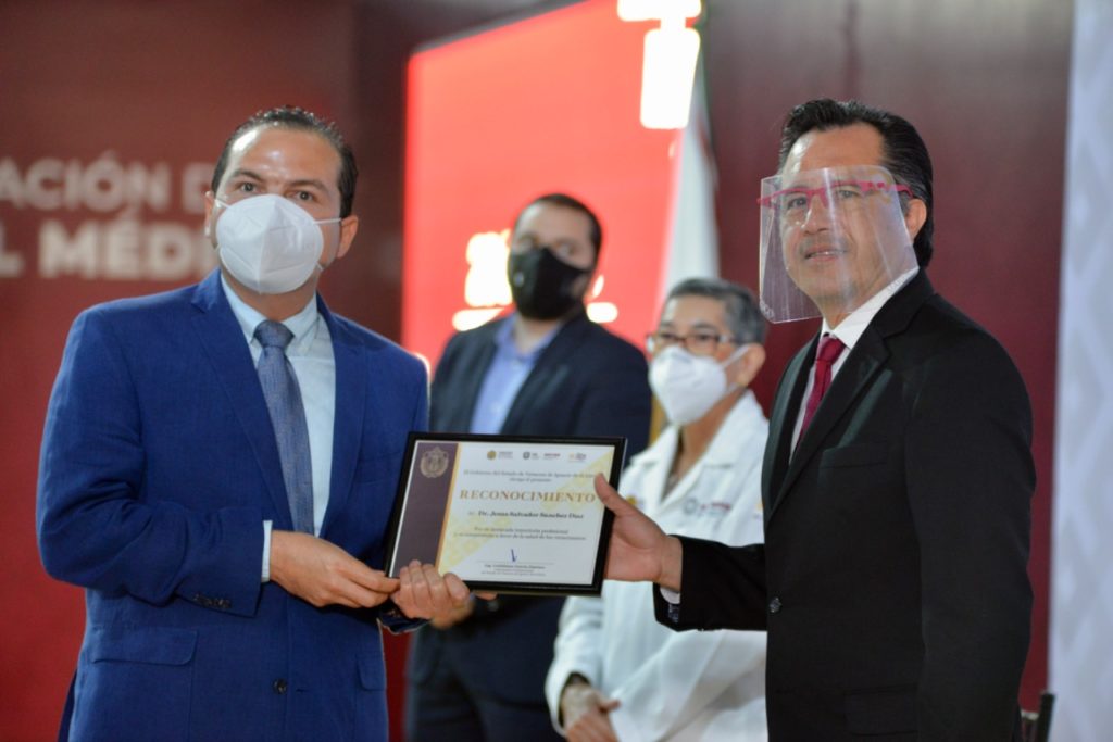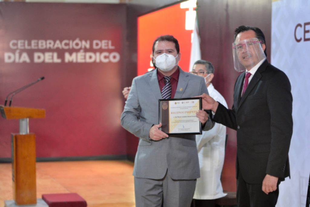 Xalapa, Ver.- El Gobernador Cuitláhuac García Jiménez reconoció a los médicos veracruzanos. En Palacio de Gobierno entregó galardones a 10 médicos y médicas veracruzanos por su labor profesional en el Instituto Mexicano del Seguro Social (IMSS), Instituto de Seguridad y Servicios Sociales para los Trabajadores del Estado (ISSSTE), hospitales de Petróleos Mexicanos (Pemex), de la Secretaría de la Defensa Nacional (SEDENA), la Secretaría de Marina (SEMAR) y de la Universidad Veracruzana..