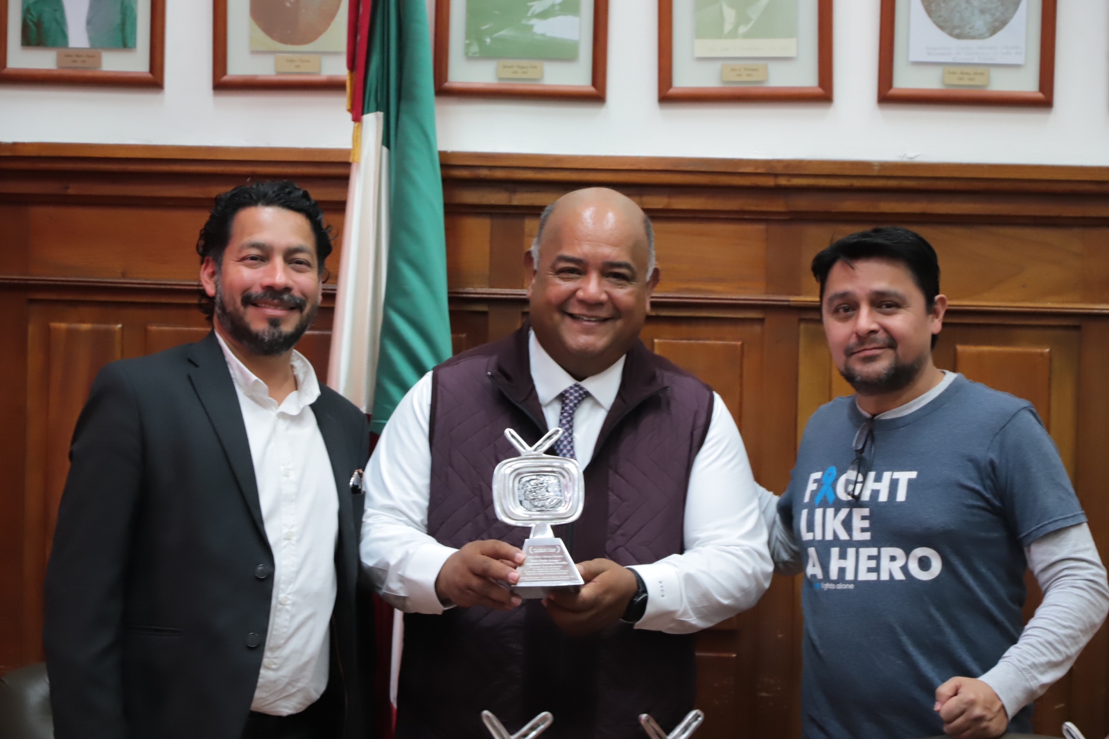 Este miércoles, los realizadores de “Detrás del Arcoiris”, Eder Ortiz Arano y Emmanuel Jiménez Portilla, quienes ganaron las categorías de mejor banda sonora y musicalización, así como el periodista Hugo Garizurieta Bernabé; y los camarógrafos que realizaron el reportaje “Café de Cosautlán”, José Luis Guevara y Aurelio Hernández, ganadores en las categorías de mejor fotografía y camarógrafo, así como el director general de Radiotelevisión de Veracruz, Víctor Hugo Cisneros Hernández, fueron recibidos en palacio por el secretario de Gobierno en Veracruz, Eric Cisneros Burgos, quien los felicitó y motivó a seguir creando contenidos de alta calidad e interés.