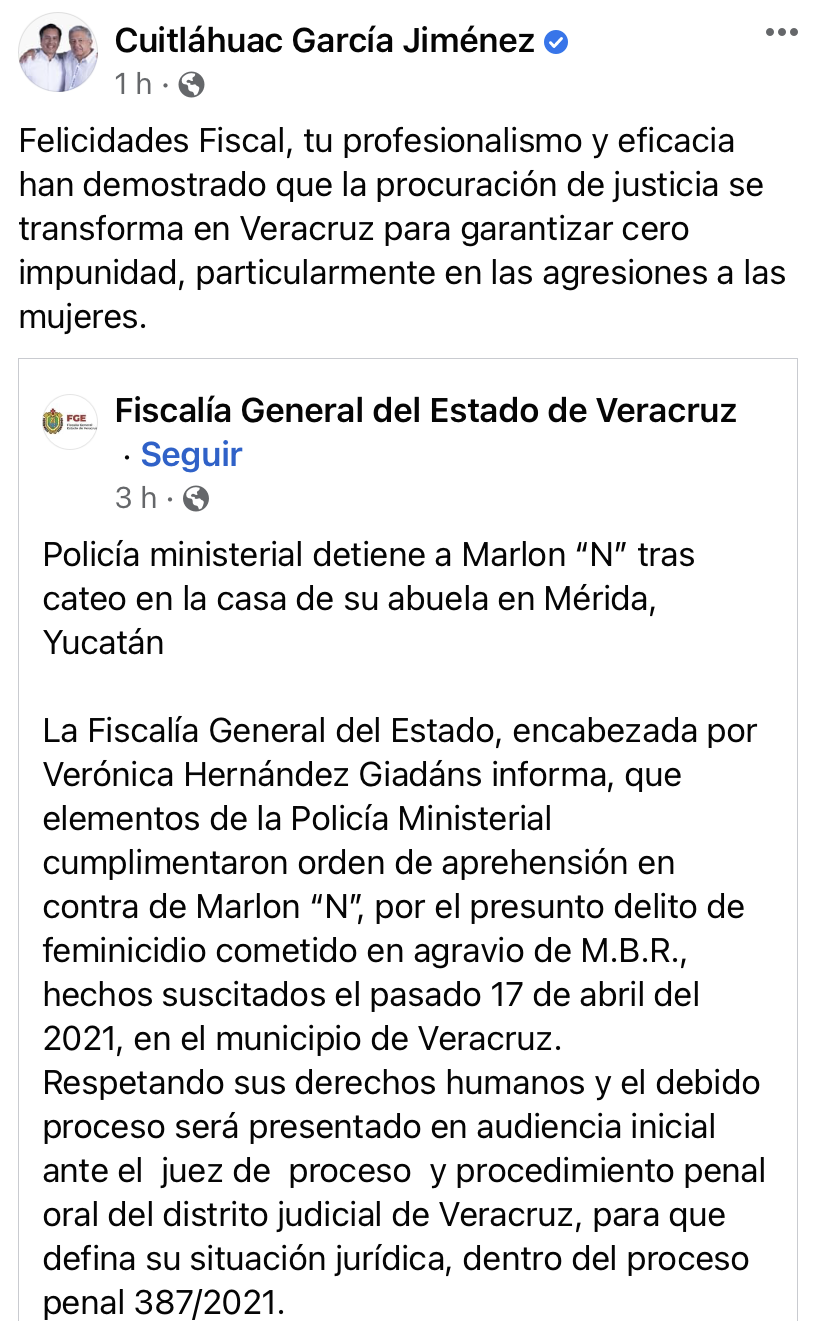 «Felicidades Fiscal, tu profesionalismo y eficacia han demostrado que la procuración de justicia se transforma en Veracruz para garantizar cero impunidad, particularmente en las agresiones a las mujeres», posteó en sus redes sociales, el mandatario estatal.