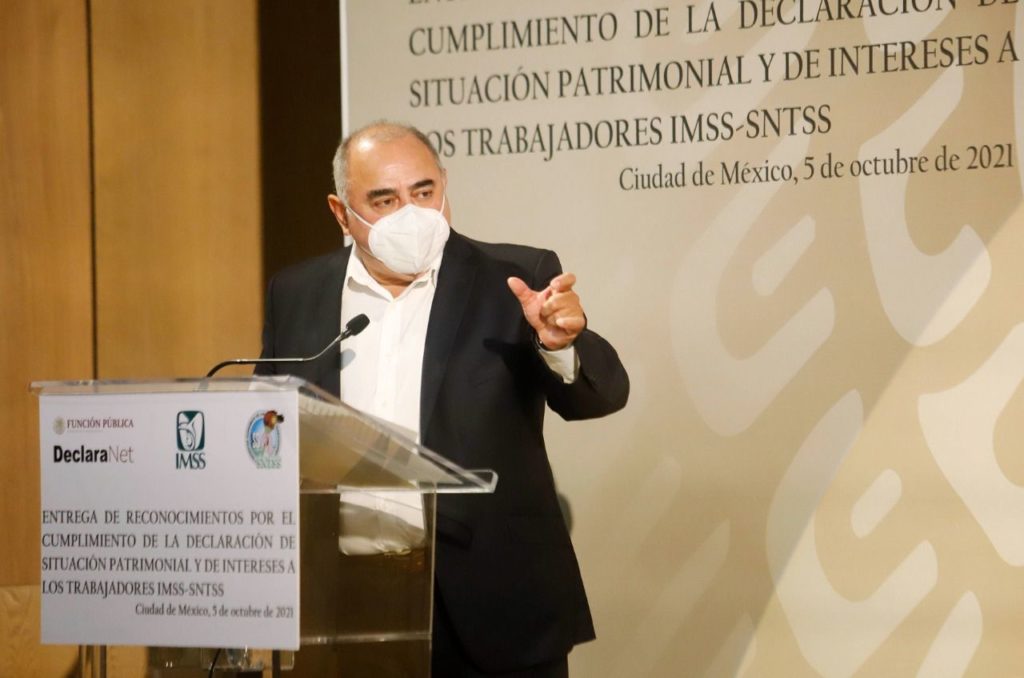 Ciudad de México.-El Instituto Mexicano del Seguro Social (IMSS) recibió un reconocimiento de la Secretaría de la Función Pública (SFP) por cumplir con la entrega de la declaración patrimonial y de intereses 2021 de los trabajadores afiliados al Sindicato Nacional de Trabajadores del Seguro Social (SNTSS), y alcanzar el 99.90 por ciento de la meta, la mayor de la Administración Pública Federal.