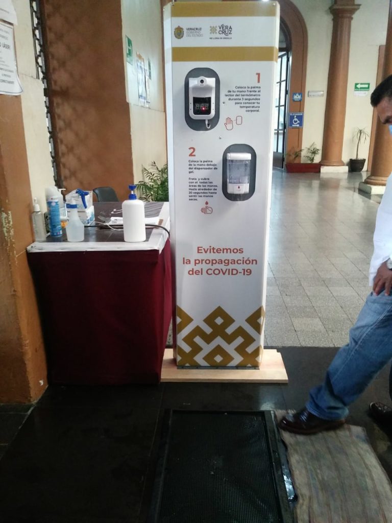 De tal forma que quienes vayan al Palacio de Gobierno tendrán que pasar por dichos módulos en donde, primero, colocarán su mano frente al termómetros automático, después se aplicarán gel antibacterial en sus manos y por último pasarán sobre los tapetes sanitizantes.
