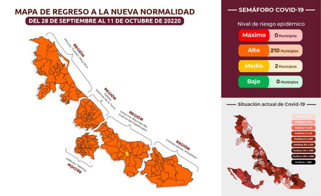 A nivel federal, Veracruz está en color naranja que representa riesgo alto en el Semáforo Epidemiológico. El Semáforo Regional en la entidad queda establecido de la siguiente manera: