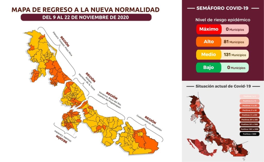 En la región Veracruz-Boca del Río-cuenca del Papaloapan, vemos solamente 6 municipios que actualmente permanecen en riesgo alto, estos son: Veracruz, Ursulo Galván, Soledad de Doblado, Cosamaloapan y Carlos A. Carrillo los demás municipios se encuentran en riesgo medio y los invitamos a seguir trabajando para bajar aún más el semáforo.