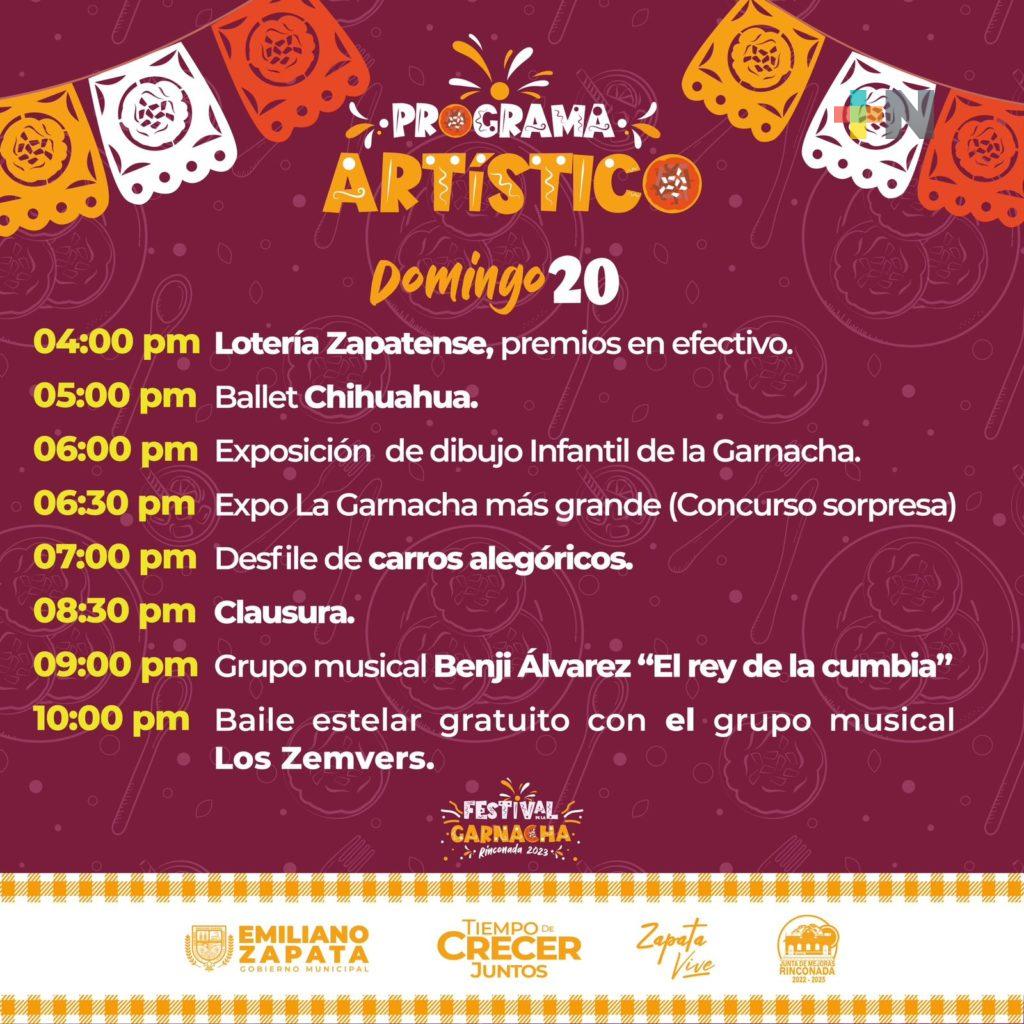 El domingo 20 de agosto, la diversión continúa con la Lotería Zapatense con premios de 2 mil, mil 500 y mil pesos a los tres primeros lugares, respectivamente; la Exposición de Dibujo Infantil de la Garnacha y “La Garnacha Más Grande” junto con un concurso sorpresa. El desfile de carros alegóricos será el último día, que cerrará con la presentación de “Los Zemvers”.