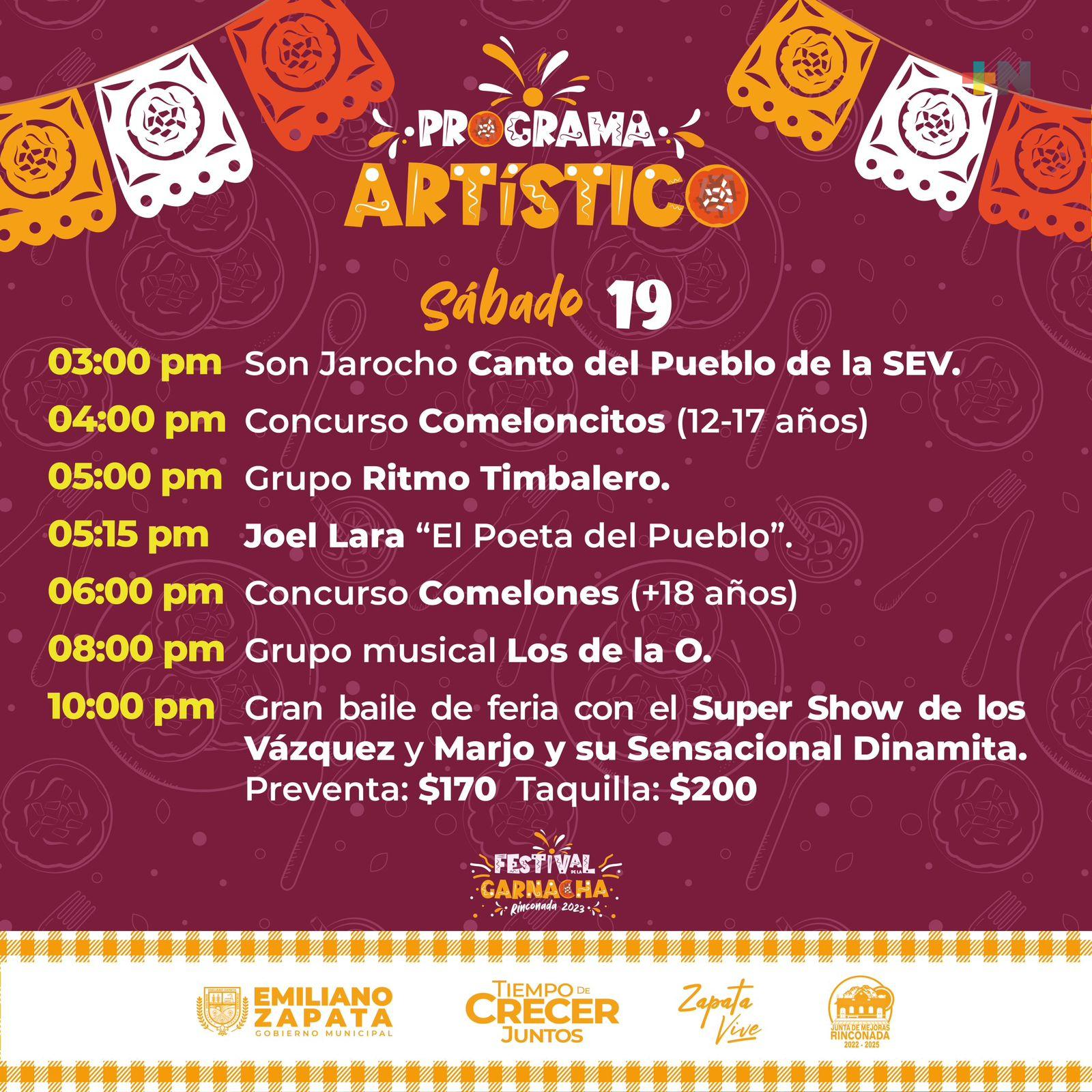 El viernes 18 de agosto será la coronación de la Corte Real; el sábado 19 de agosto el concurso de “Comeloncitos”, de 12 a 17 años, con 3 mil pesos para el primer lugar, 2 mil para el segundo y mil para el tercero; y “Comelones”, para adultos, con 4 mil pesos para el primer puesto; 3 mil para el segundo; y 2 mil para el tercero.