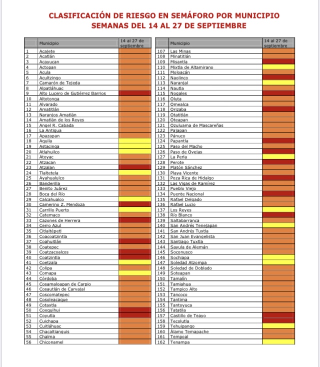 Xalapa, Ver.- De acuerdo con el semáforo epidémico presentado este viernes a nivel nacional, Veracruz regresará a partir del próximo 14 de septiembre al color naranja, es decir, de riesgo alto por contagios de Covid–19.