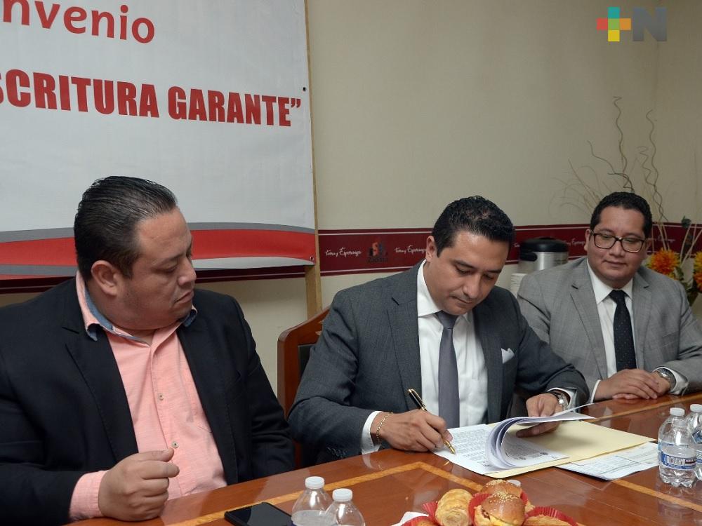 Emiliano Zapata, Ver.- La Secretaría de Educación de Veracruz (SEV), a través de la Dirección Jurídica, llevó a cabo la firma de convenio de colaboración con autoridades municipales, a fin de beneficiar por medio del programa «Escuela garantizada, escritura garante», a las escuelas que carecen de un título de propiedad.