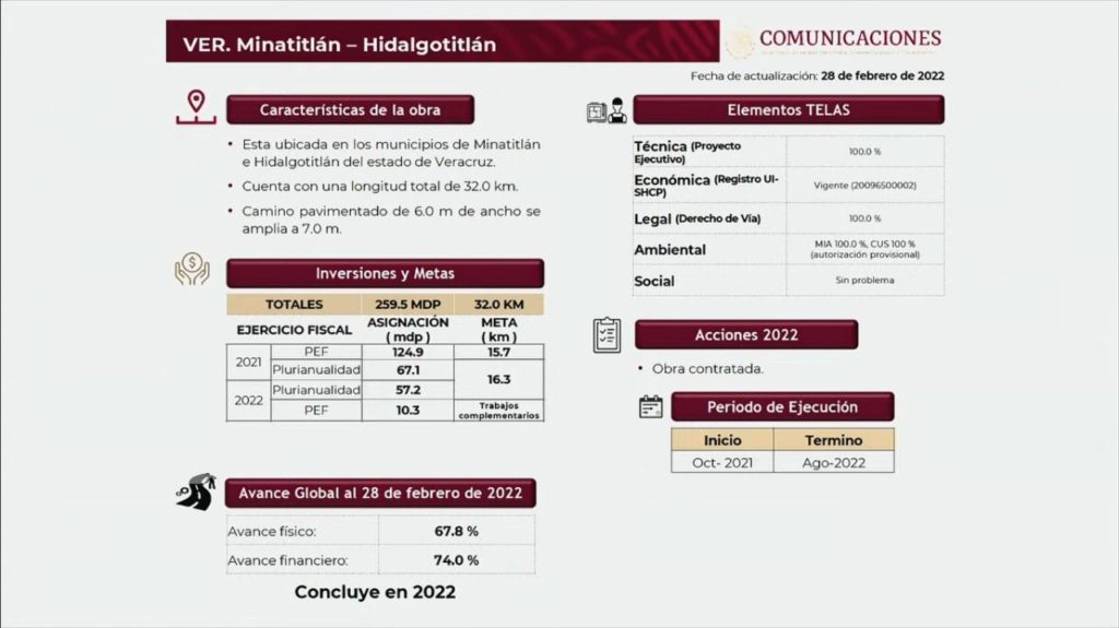 El Mandatario se refirió a una de las obras, compromiso de su Gobierno, la Minatitlán – Hidalgotitlán que abarca 32 kilómetros y tiene un avance del 67.8% debiendo concluir esté año; además este mismo jueves se firmó otro contrato para 4 kilómetros más en concreto hidráulico.