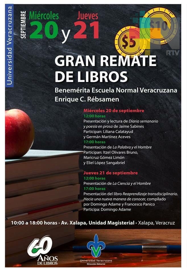 Xalapa, Ver.- Este 20 y 21 de septiembre la Editorial de la Universidad Veracruzana (UV) realizará de 10 de la mañana a 6 de la tarde el gran remate de libros en la Benemérita Escuela Normal Veracruzana, con precios de entre 5 y 10 pesos.