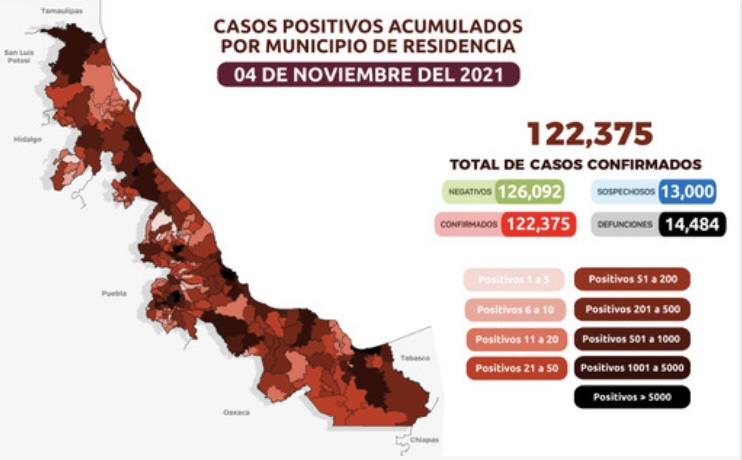 Xalapa, Ver.- Al corte de las 19:00 horas, la Secretaría de Salud (SS) confirma 122 mil 375 (+ 97 nuevos) casos de COVID-19 en la entidad, de 261 mil 467 eventos analizados.