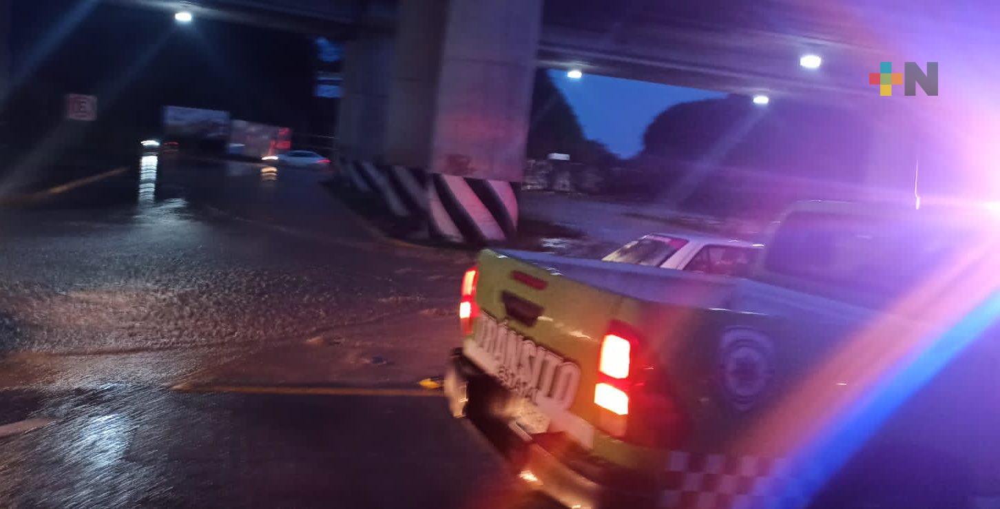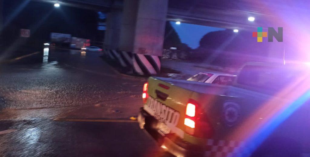Xalapa, Ver.- Derivado de los encharcamientos generados por la lluvia en la planta baja del distribuidor de la Central de Abastos, elementos de la Secretaría de Direcci´ón General de Tránsito y Seguridad Vial agilizan la circulación.