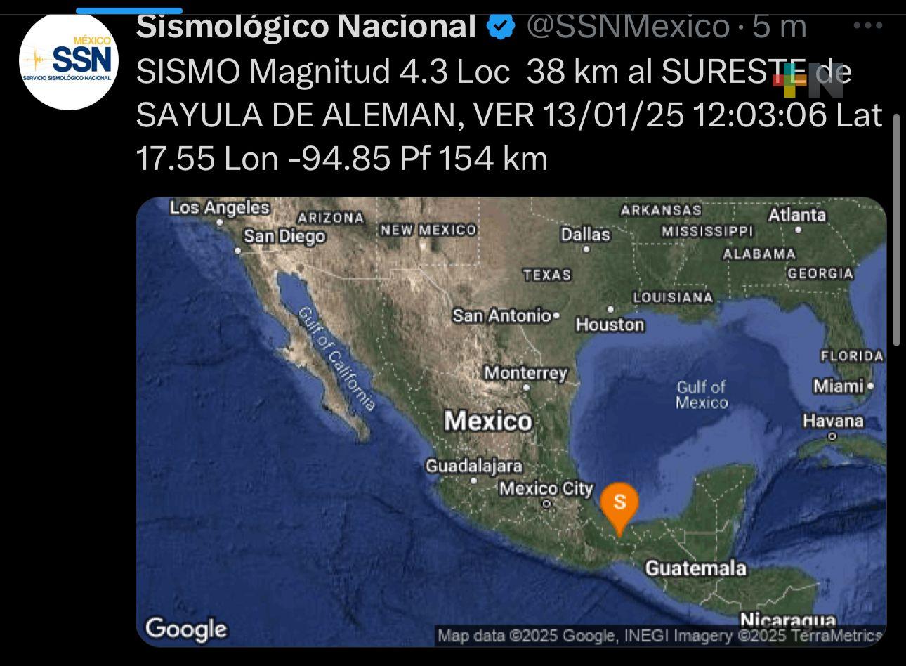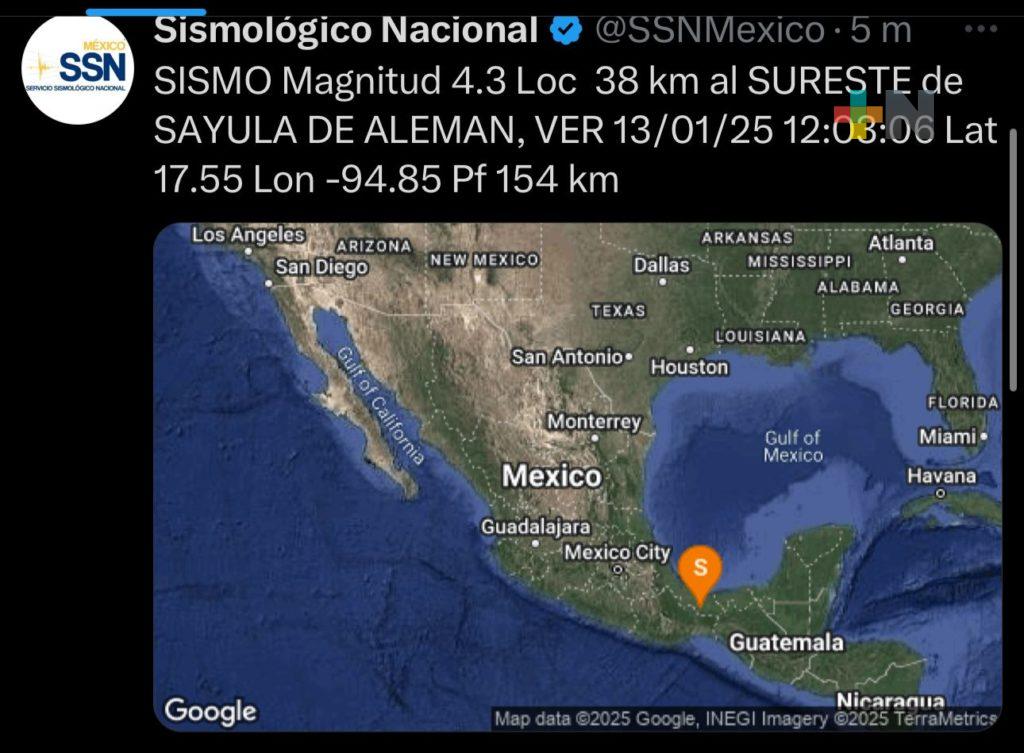 Reportan sismo de 4.3 grados en municipio de Sayula de Alemán
