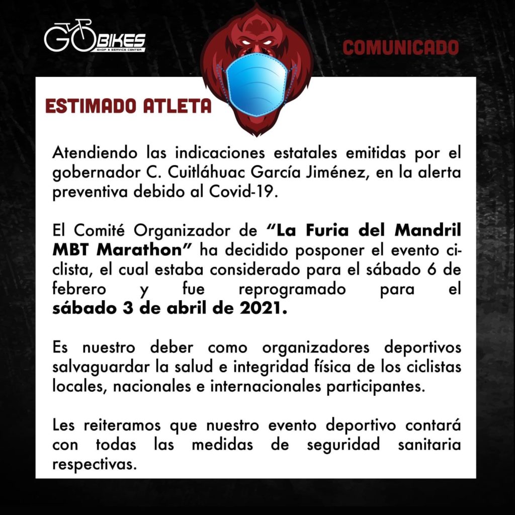 El Comité Organizador de “La Furia del Mandril MBT Marathon” ha decidido posponer el evento ciclista, el cual estaba considerado para el sábado 6 de febrero y fue reprogramado para el sábado 3 de abril de 2021.