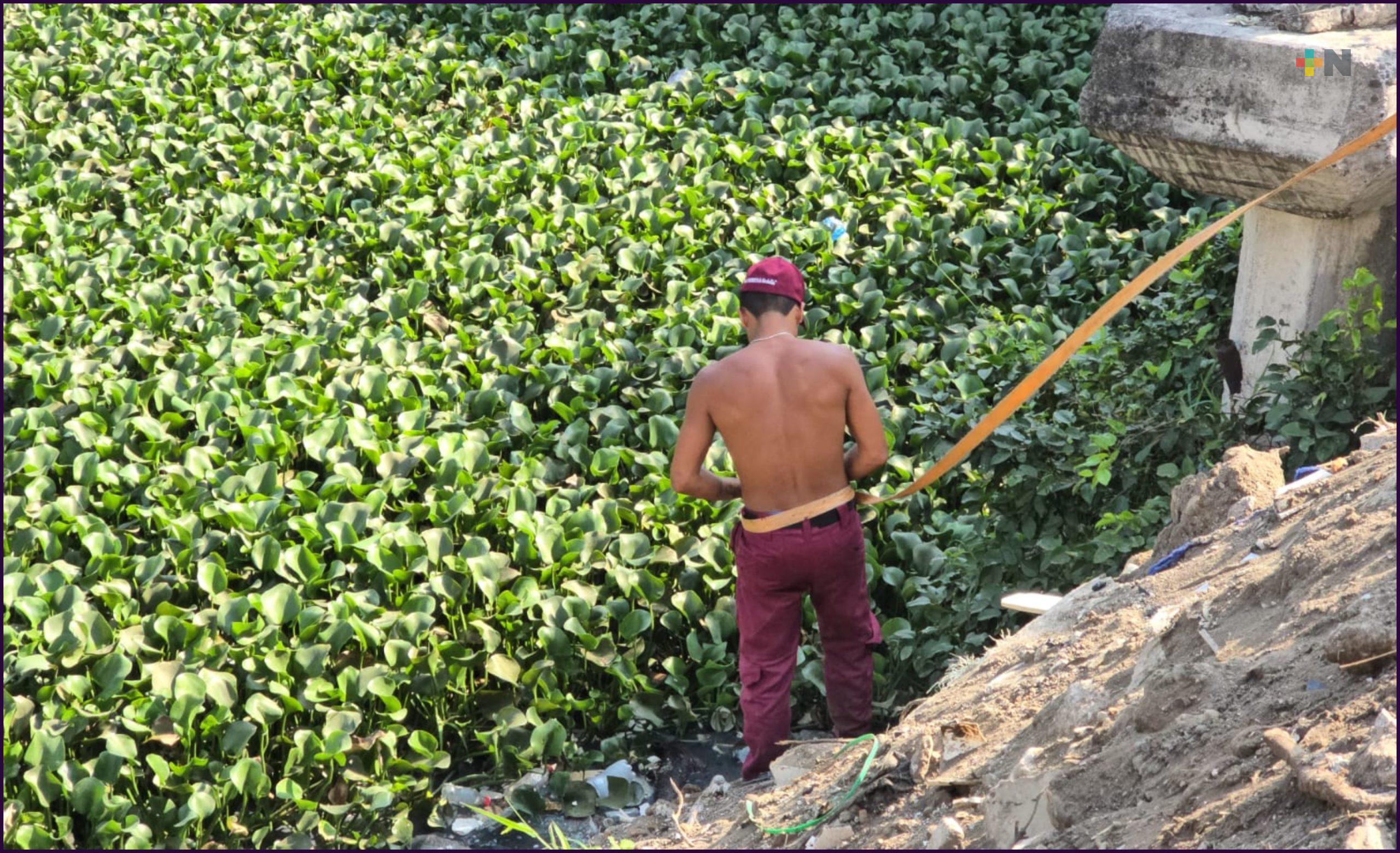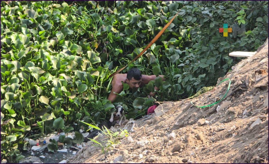 Veracruz, Ver.- Personal de la Dirección de Protección Civil Municipal de Medellín de Bravo rescataron a una cachorra que quedó atrapada en medio del lirio del Arroyo Moreno.