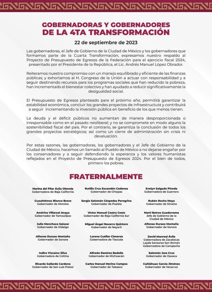 «Expresamos nuestro respaldo al Proyecto de Presupuesto de Egresos de la Federación para el ejercicio fiscal 2024, presentado por el Presidente de la República, el Lic. Andrés Manuel López Obrador», publicó García Jiménez en sus redes sociales este sábado a medio día.