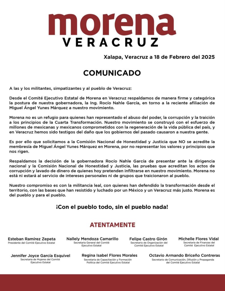 Xalapa, Ver.- El Comité Ejecutivo Estatal de Morena respalda a la Gobernadora Rocío Nahle en su petición de frenar el ingreso de Miguel Ángel Yunes Márquez al partido; sostienen que Morena no será refugio para quienes han representado el abuso del poder, la corrupción y la traición a los principios de la cuarta transformación.