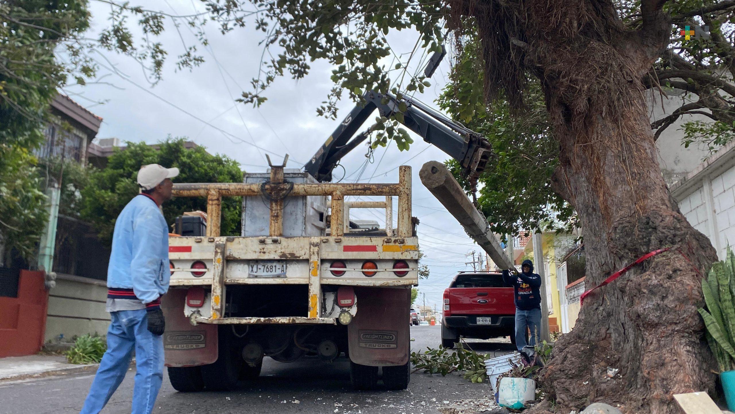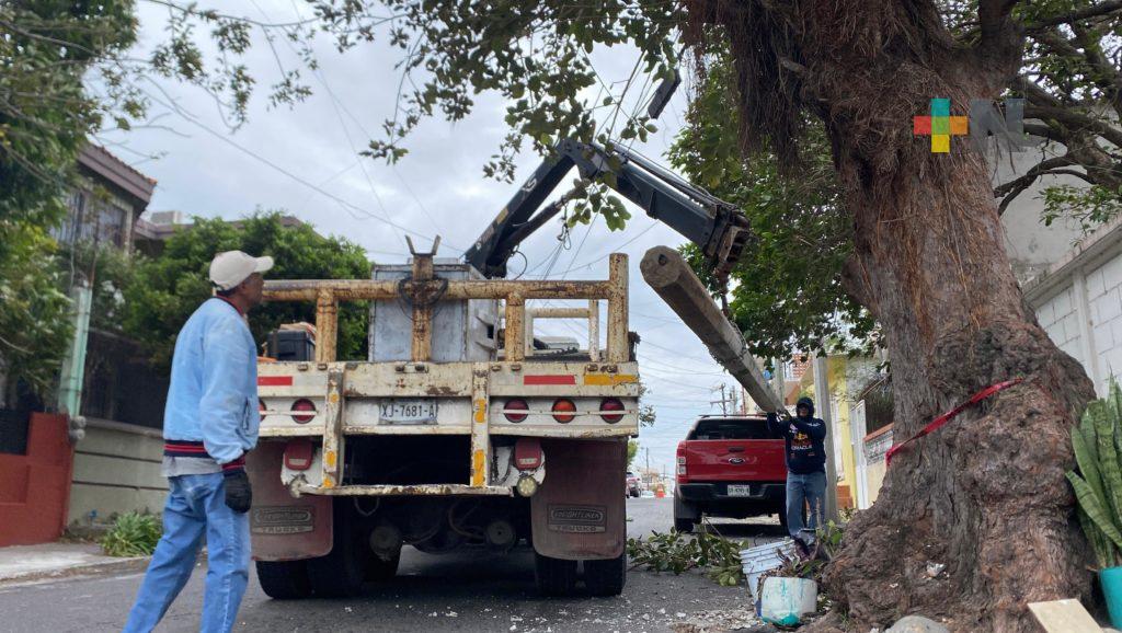 Veracruz, Ver.- En la calzada Juan Pablo II y calle Fray Bernardino de Sahagún llevan a cabo las tareas para retirar el poste de luz desprendido por las fuertes rachas de viento.