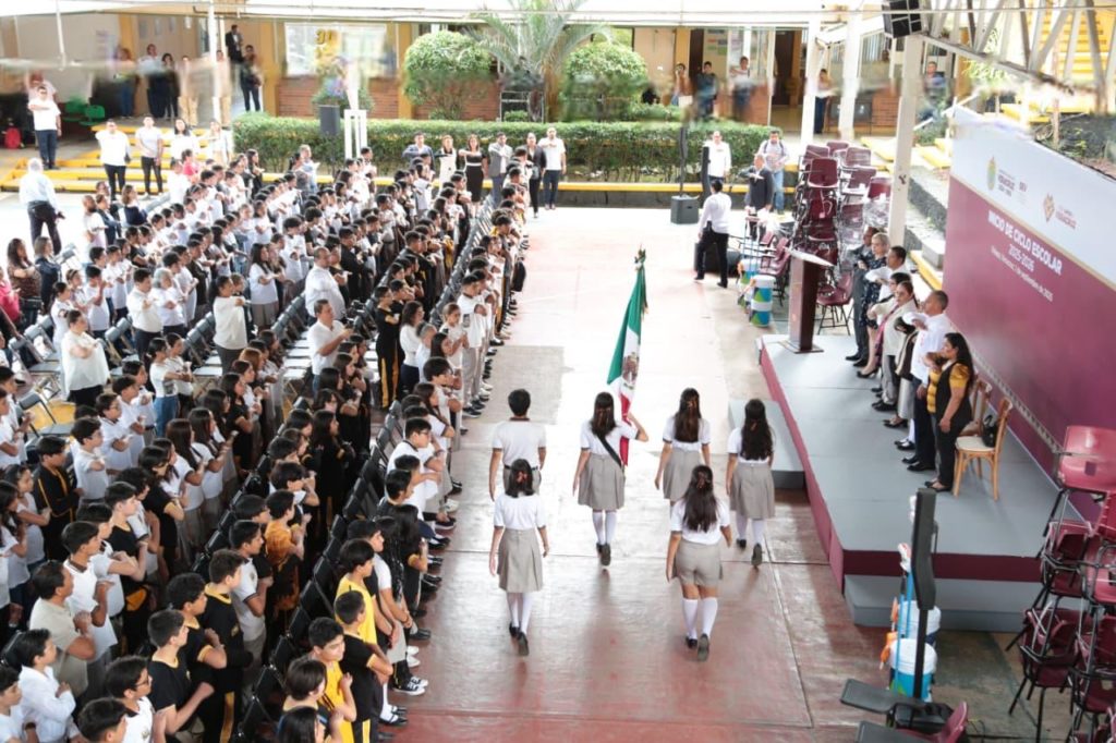 Destacó las políticas públicas que impulsan los gobiernos Federal y Estatal en beneficio de la población estudiantil para que sigan avanzando en su formación académica, bajo los principios de la Nueva Escuela Mexicana.