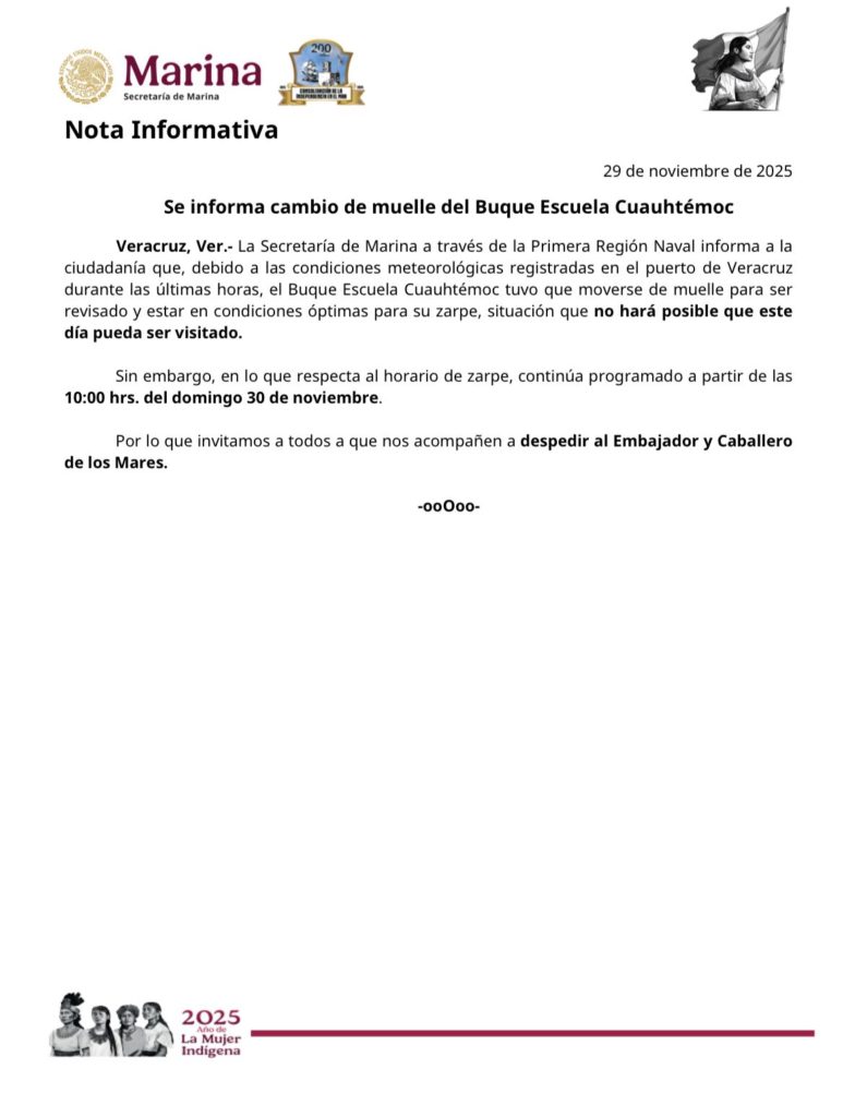 La maniobra busca garantizar que el navío quede en condiciones óptimas para su zarpe programado, el domingo 30 de noviembre a partir de las 10:00 de la mañana, de acuerdo con la Primera Región Naval. La Secretaría de Marina invitó a la ciudadanía a acudir a despedir al “Embajador y Caballero de los Mares”.