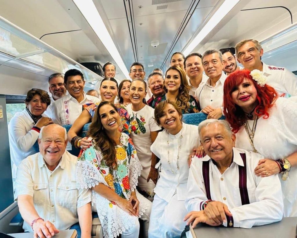 Cancún, Quintana Roo.- La gobernadora electa de Veracruz, Rocío Nahle García, acudió al lado del presidente Andrés Manuel López Obrador y de la presidenta electa, Claudia Sheinbaum Pardo, a la puesta en marcha de la ruta Cancún-Chichén Itzá-Teya del Tren Maya inaugurada hoy.