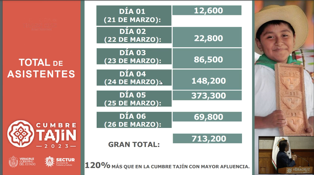 Xalapa, Ver.- En conferencia de prensa, el gobernador del Estado, Cuitláhuac García Jiménez, reveló que la Cumbre Tajín 2023 registró una afluencia mayor a los 700 mil visitantes y una derrama económica superior a los 500 millones de pesos.