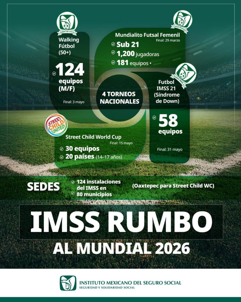 Ciudad de México.- El director general del Instituto Mexicano del Seguro Social (IMSS), Zoé Robledo, informó que con motivo de la Copa Mundial FIFA 2026, que se desarrollará en México, Estados Unidos y Canadá, la institución ampliará la oferta deportiva en sus instalaciones para promover la práctica de este deporte.