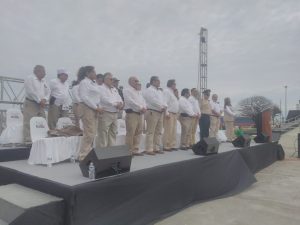 Previo a la ceremonia realizada en el explanada de la torre de Pemex, los trabajadores, así como unidades utilizadas para la extracción de petróleo desfilaron por calles de la ciudad de Veracruz.