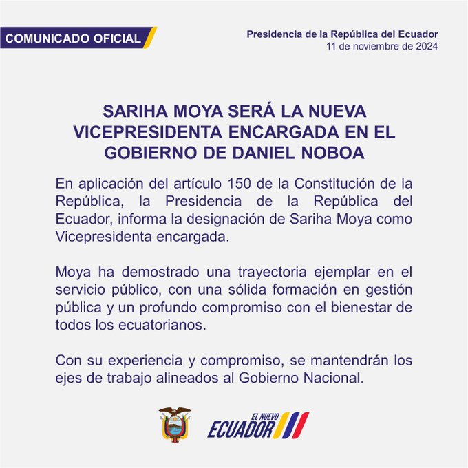 A través de un comunicado, la Presidencia de la República de Ecuador informó que la decisión se basó en el artículo 150 de la Constitución, que habla sobre la ausencia temporal del vicepresidente o vicepresidenta.